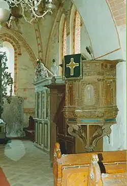 Das Hauptstück der Ausstattung ist ein barocker Altaraufsatz von 1720/30 mit einem Kreuzigungsgemälde in einer Säulenarchitektur, der in den geschnitzten Wangen Putten zwischen Fruchtgehängen zeigt und von einem Medaillon mit einer Auferstehungsszene bekrönt wird. Die schlichte Kanzel mit Nischenarchitektur entstammt der zweiten Hälfte des 17. Jahrhunderts. Der frühgotische Taufstein wurde wohl in der zweiten Hälfte des 13. Jahrhunderts aus Granit gearbeitet. Weiter zu erwähnen sind zwei Patronatslogen im Zopfstil vom Ende des 18. Jahrhunderts. Mehrere Grabsteine zeigen in eingetiefter Zeichnung die Verstorbenen. Der älteste Grabstein ist der, den Pfarrer Gherard Leuwentkoper seiner Mutter Ava († 1393), seinem Vorgänger Nicolas Rasor und sich selbst setzte. Zwei Grabsteine von 1588 und 1672 wurden für Mitglieder der Familie von Drieberg gesetzt.