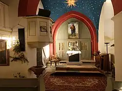 Das Kirchenschiff besitzt dreiseitige Emporen mit Chor- und Kreuzgewölbe und eingebauter Apsis als Sakristei.
