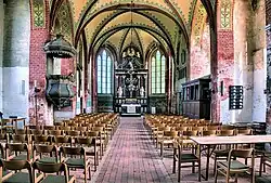 Nur die Strebepfeiler des Chorpolygons stehen nach außen vor. Das Schiff ist ein Abseitensaal, bei dem die Trennwände zwischen den Kapellen als Strebepfeiler dienen. Das letzte Joch vor dem Chorpolygon hat keine Kapellen. Die Sakristei an der Nordseite wurde gleichzeitig mit Chor errichtet. Der Eingangsbau auf der Südseite hat ein Sockelgeschoss aus massiven Backsteinmauern und aus dem 17. oder 18. Jahrhundert ein Obergeschoss aus Fachwerk. Das Portal ist zum Eingangsbau hin als Stufenportal gestaltet. Der Kirchenraum ist mit Kreuzrippengewölben gedeckt, ein Joch im Turm und vier Joche im Langhaus. Im Gegensatz zu den Spitzbögen der Fenster sind die Scheidebögen zwischen den Jochen des Langhauses rund und die Diagonalrippen der Langhausjoche nur ganz leicht gespitzt. Das Maßwerk der Fenster wurde in der Neuzeit ersetzt.