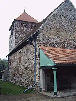Die Kirche wurde wahrscheinlich um 1200 im romanischen Baustil aus Feldsteinen errichtet und zählt zu den wenigen Kirchen mit östlichem Chorturm. Der Chorraum ist rechteckig, an ihn schließt sich eine kleine Apsis an. Hier und im Kirchenschiff sind zum Teil die typischen kleinen romanischen Fensteröffnungen vorhanden. An der Nord- und Südwand des Kirchenschiffs sind noch zwei vermauerte Rundbogenportale zu erkennen.