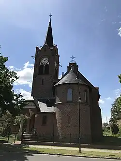 Im Südosten schließt sich ein rechteckiger Vorbau an. Über eine kleine offene Vorhalle können sowohl das Schiff von Süden wie auch der Turm von Westen her betreten werden. Daran schließt sich nach Norden die halbrunde Apsis an. Sie besitzt im westlichen Bereich ein schmales Fenster. Darüber ist ein umlaufendes Gesims sowie drei große Rundbogenfenster. Im westlichen Teil des Vorbaus erhebt sich der Kirchturm. Er besitzt im unteren Geschoss an seiner Südseite zwei gekuppelte und rundbogenförmige Fenster. Darüber ist eine hochrechteckige, schlitzförmige Öffnung gefolgt von einer Sonnenuhr. Oberhalb sind an den zugänglichen Seiten jeweils eine weitere schlitzförmige Öffnung, gefolgt vom Glockengeschoss. In einer Rundbogenblende sind zwei gekuppelte, rundbogenförmige Klangarkaden sowie darüber eine Turmuhr verbaut. Die Giebel sind wiederum mit Fialen verziert. Oberhalb erhebt sich der achteckige Turmhelm, der mit einem Kreuz abschließt.