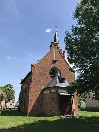 Das Bauwerk entstand im Wesentlichen aus rötlichem Mauerstein auf einem schmalen Sockel aus unbehauenen Feldsteinen. Das Kirchenschiff hat einen rechteckigen Grundriss. Die nördliche Seite des Langhauses wird durch vier Strebepfeiler in drei Felder gegliedert. Im unteren Bereich ist je mittig eine schmale und hochrechteckige Öffnung. Darüber sind jeweils zwei gekuppelte Rundbogenfenster. Sie werden im Westen durch ein kleines, tieferliegendes und hochrechteckiges Fenster ergänzt. Die Südseite des Langhauses wurde – bis auf den Turm im Südosten – symmetrisch errichtet, allerdings fehlt das tiefergesetzte Fenster im westlichen Bereich.
