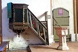 Die reich mit Schnitzwerk im Renaissancestil verzierte Kanzel mit Korb vom Jahre 1651 ist am Treppenaufgang durch Malereien geschmückt, von denen Darstellungen von Moses und Aaron erhalten sind. Der Schalldeckel wurde im Jahr 1663 hinzugefügt. Ein geschnitztes Kruzifix stammt aus der Mitte des 15. Jahrhunderts. Aus dem 19. Jahrhundert stammen der Taufstein und die Empore. Eine größere Anzahl von Abendmahlsgeräten (Kelche, Patenen vom Anfang des 15. Jahrhunderts und eine Dose von 1746) sowie Leuchter und Taufstein ergänzen die liturgische Ausstattung.