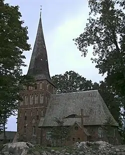 Der Turm mit dem rundbogig überwölbten Hauptportal mit Kreisblende ist „gegen den Sturm“ gebaut. Auch die „schiefe“ Turmhaube ist im Gebälk gegen Westen gestützt. Viele Jahrhunderte hindurch war der Kirchturm ein Seezeichen für die Küstenschiffe auf der Ostsee und für die Fischer der nahegelegenen Ostseedörfer, wenn sie vom Fang heimkehrten.