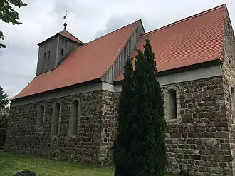 Das Kirchenschiff hat einen rechteckigen Grundriss. Die östliche Wand ist aus Feldsteinen, der Giebel verbrettert. An der Nordseite sind die Reste von zwei mit Gesteinssplittern zugesetzten Fenstern erkennbar. Mittig ist ein großes Rundbogenfenster mit einer Laibung aus Mauerstein. An der Südseite sind drei große Fenster, gefolgt von einem westlich gelegenen, hochgesetzten Rundbogenfenster. Unterhalb des mittleren Fensters sind die Reste einer zugesetzten Gemeindepforte erkennbar. Auch sie dürfte aus der Bauzeit stammen. Am Übergang zur Dachtraufe ist ein umlaufendes, verputztes Band. Chor und Schiff tragen ein schlichtes Satteldach, das mit Biberschwanz gedeckt ist.
