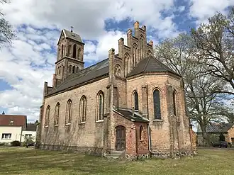 Das Bauwerk wurde im Wesentlichen aus Mauersteinen auf einem umlaufenden Sockel aus Feldstein errichtet. Der Chor ist stark eingezogen und hat einen Fünfachtelschluss. In jedem Feld ist ein hohes, zweifach profiliertes Spitzbogenfenster, dazwischen zweifach getreppte Strebepfeiler. Seitlich sind zwei Anbauten mit je einem spitzbogenförmigen Fenster nach Osten und einem weiteren Strebepfeiler an den Ecken. Am Übergang zum Dach ist eine umlaufende Voute. Der Staffelgiebel ist durch einen nach unten geöffneten Fries vom Chor abgetrennt. Er ist in sieben Segmente unterteilt, die mit Fialen verziert sind. Darin sind spitzbogenförmige Blenden, in die jeweils wiederum zwei spitzbogenförmige Blenden eingelassen wurden, darüber jeweils eine kreisförmige Blende.