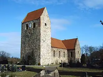Die Kirche hat ihren Ursprung Anfang des 13. Jahrhunderts[1], nach anderen Quellen bereits Ende des 12. Jahrhunderts.[2] Von diesem spätromanischen Bau ist jedoch nur der westlich des Kirchenschiffs befindliche Westquerturm erhalten geblieben. Der Turm verfügt über Schallöffnungen in Rundbogenform und wird von einem Satteldach abgeschlossen. Die Westwand und die Eckgewände wurden im 19. Jahrhundert ausgebessert.