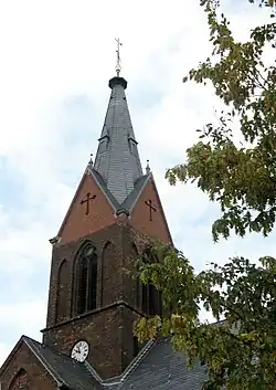 Die 1999 rekonstruierte Turmspitze orientiert sich an den Originalfarben von 1875 und fällt durch hellere Materialien auf das Kirchengebäude auf.
