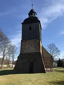 Der Westturm ist quadratisch und gegenüber dem Schiff stark eingezogen. Er wird von zwei Strebepfeilern aus dunklem Mauerstein an der Nordwest- und Südwestecke stabilisiert. Diese spannen nach Westen hin eine nach oben abfallende Fassade auf, die gänzlich aus Mauerstein errichtet wurde. Darin ist ein spitzbogenförmiges Portal. Die übrigen Fassadenelemente sind bis kurz unterhalb des Dachfirsts des Kirchenschiffs aus Mischmauerwerk entstanden. Dort ist an der Nord- und Südseite je eine segmentbogenförmige Öffnung. Darüber ist ein verbretterter Aufsatz mit je einer schmalen, hochrechteckigen Klangarkade. Darauf ist eine geschweifte Turmhaube, die mit einem achteckigen Turmhelm und einer Turmkugel abschließt.