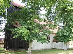 Der verbretterte Westturm aus Holz ist mit Ziegeln gedeckt. Er stammt ebenso wie der Fachwerkgiebel vom Ende des 18. Jahrhunderts.