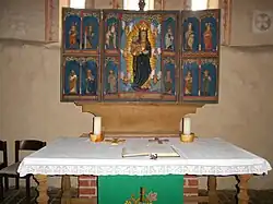 Das Hauptstück der Ausstattung ist der zweiflügelige Schnitzaltar vom Ende des 15./ Anfang des 16. Jahrhunderts, der im Schrein eine apokalyptische Madonna und zwölf Heilige in zwei auf den Flügeln fortgesetzten Reihen übereinander zeigt. Die umgebenden Heiligen wurden im 19. Jahrhundert umgestellt. Zu erkennen sind noch folgende Heilige: Barbara mit Turm, Gertrud mit Hospital, Katharina mit Rad, Apostel Johannes mit Kelch, Elisabeth mit Korb, Petrus mit Schlüssel, Matthias mit Beil und Nikolaus von Tolentino.[11] Das bekrönende Kruzifix stammt aus der zweiten Hälfte des 14. Jahrhunderts.
