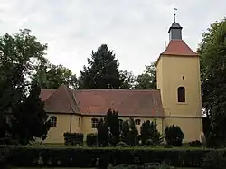Die Saalkirche ist im Kern eine Feldsteinkirche aus dem 14. Jahrhundert. Sie wurde 1716 in anderem Mauerwerk nach Osten verlängert und durch ein Querschiff zur Kreuzkirche erweitert. Gleichzeitig wurde der Kirchturm im Westen bis auf das von drei Strebepfeilern gestützte Erdgeschoss abgetragen und in Ziegeln neu errichtet. Die aufgestockten Geschosse sind bis auf die Lisenen an den Ecken schmucklos. Bedeckt ist der Kirchturm mit einem Zeltdach, aus dem sich ein 1891 erneuerter schiefergedeckter Dachreiter erhebt, der von einer Glockenhaube bekrönt wird. An der Südseite des Kirchturms befinden sich die Wappen der Familien von Görne und von Treskow.