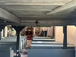 Das Altarretabel besteht aus einem zweigeschossigen Säulenaufbau aus dem Jahr 1683, der mit Wangen und Dekor verziert wurde. Im Altarblatt ist ein Gemälde, das das Auge Gottes und den Gekreuzigten zeigt. Es stammt aus der Mitte des 19. Jahrhunderts. Die hölzerne Kanzel entstand in der zweiten Hälfte des 17. Jahrhunderts. Im vorderen Bereich des Bauwerks befindet sich eine verglaste Patronatsempore mit Pilastergliederung, die zur gleichen Zeit entstand. Sie ist mit Wappen verziert, die nach 1790 aufgemalt wurden. Ebenfalls mit Wappen verziert sind zwei Bleiglasfenster aus der Zeit um 1885 und 1918. Im Norden und Westen befindet sich je eine Empore. Die westliche schwingt leicht hervor. Darauf steht eine Orgel, die Johann Wilhelm Grüneberg im Jahr 1791 schuf und die 1979 restauriert wurde. Das Bauwerk ist im Innern flach gedeckt und verfügt über einen mittleren Unterzug.