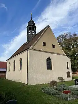 Das Bauwerk trägt ein schlichtes Satteldach, in das der Anbau integriert wurde. Oberhalb des Dachs erhebt sich mittig ein zentral angebrachter, achteckiger Dachreiter aus Holz, der 1888 erneuert wurde.