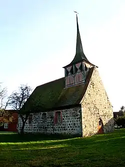 Die Feldsteinkirche wurde um 1300 erbaut. Dem Satteldach des Langhauses wurde im 17. Jahrhundert im Westen ein Dachturm aus Holzfachwerk aufgesetzt, der im Innenraum, der mit einer Holzbalkendecke überspannt ist, auf hölzernen Säulen ruht. Seine Gefache sind mit Backsteinen ausgefüllt, und er ist mit einem achtseitigen, schiefergedeckten Knickhelm bedeckt. Eine außenliegende Treppe auf der Südseite endet in einer Dachgaube, von der im Innern der Glockenstuhl im Dachturm erschlossen ist.