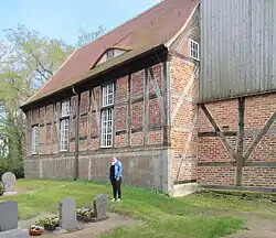 Der gegen Ende des 18. Jahrhunderts entstandene Fachwerkbau wird vom örtlichen Friedhof umgeben. In unmittelbarer Nachbarschaft ist das ehemalige Pfarrhaus zu finden, welches heute ebenfalls unter Denkmalschutz steht.[1]