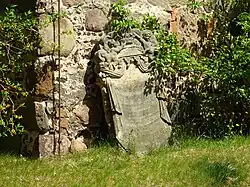 An der Südwand der Kirche ist ein mit Putten versehener Inschriften-Grabstein aus dem Jahre 1716 zu finden.[2] Weiters befindet sich an der Nordempore der Kirche eine Erinnerungstafel aus Eisenguss für den 1871 gefallenen Rittergutsbesitzer A. Mutrack.[3][1]