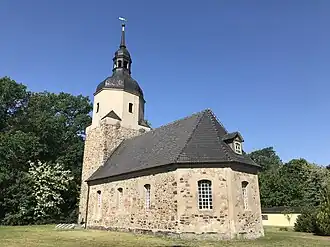 Der Westturm ist rechteckig und leicht eingezogen. Er ist leicht nach Norden versetzt und liegt dort in einer Flucht mit der Nordwand des Schiffs. An der Nordseite ist auch die rechteckige Pforte. Der verbleibende Baukörper ist bis weit über den Dachfirst des Schiffs hinaus fensterlos. Darüber ist ein schmaler, verputzter und rechteckiger Aufsatz, der in einen achteckigen Bereich übergeht. In diesem sind an vier Seiten kleine, gedrückt-segmentbogenförmige Klangarkaden. Es folgen eine geschweifte Turmhaube mit einer Laterne, die mit Turmkugel und Wetterfahne abschließt.