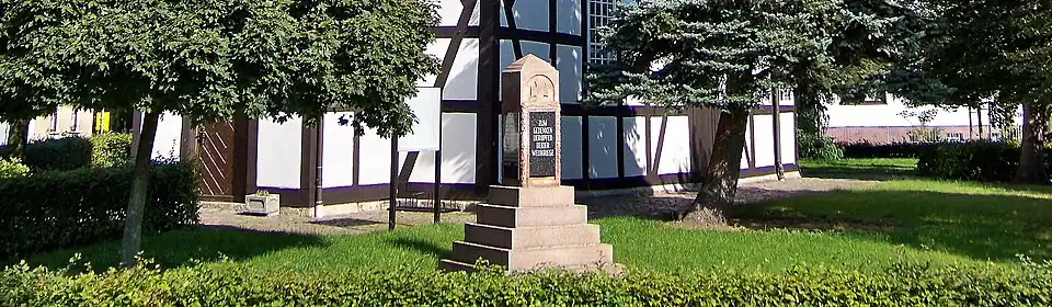 Unmittelbar vor der Kirche befindet sich ein Gefallenendenkmal für die im Ersten und Zweiten Weltkrieg gefallenen Dorfbewohner. Das Denkmal besteht aus einer auf einem fünfstufigen Sockel befindlichen Stele. An den Seiten sind Namenstafeln und an der Front eine Tafel mit der Inschrift „Zum Gedenken der Opfer beider Weltkriege“ angebracht.[9]
