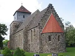 Der spätromanische Feldsteinbau steht auf einem leicht erhöhten Platz am Nordrand des Dorfes. Um die evangelische Kirche gruppieren sich die Gräber des Friedhofs und ein alter, hoher Baumbestand. Eine Feldsteinmauer umfasst einen großen Teil des Platzes. Die vollständige Anlage hat einen vierteiligen Grundriss mit Turm, Schiff, eingezogenem Chor und Apsis. Außergewöhnlich ist der Turm, der als Westquerturm in voller Schiffsbreite angelegt ist und mit seinem verjüngten, fast quadratischen oberen Glockenteil wie der Turm einer Burg anmutet.