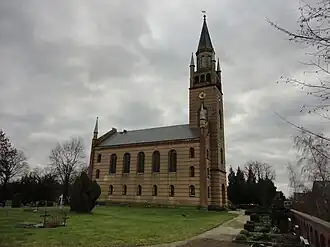 1852 vergab die Familie von der Hagen den Auftrag zum Neubau der Kirche an den Berliner Architekten Friedrich August Stüler. Der Geheime Oberbaurat war ein Schüler Schinkels. Die Kirche wurde „im italienisch-romanisierenden Stil“ errichtet.[3] Die Baukosten für die Kirche betrug etwa 30.000 Taler. Am 16. Oktober 1855 wurde der Neubau feierlich eingeweiht. Bei der Kirche handelt es sich um einen aufwändigen, einschiffigen gelben Sichtziegelbau auf einem Feldsteinsockel. Der Turm im Westen besitzt Eckfialen mit Spitzhelm. Den Turmabschluss bildet ein schlanker oktogonaler Aufsatz mit Spitzhelm. Ab 1954 erfolgte eine Sanierung der alten Holzdecke.