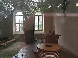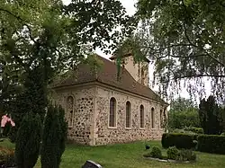 Das Bauwerk wurde aus Feldsteinen errichtet, die überwiegend nicht behauen und nicht lagig geschichtet wurden. Der Chor ist gerade und nicht eingezogen. Oberhalb eines Sockels aus Feldsteinen finden sich ein bis zwei geschichtete Lagen, die darüber vollends verlaufen. Die Wand wird von zwei zugesetzten Rundbogenfenstern dominiert, deren Form durch verputzte Faschen nochmals betont wird. Gleiches gilt für die Ecken sowie eine umlaufende Voute, die den Übergang zum Dach herstellt.
