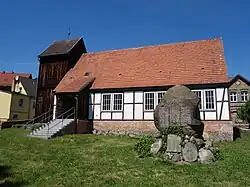 Der ursprüngliche Bau der Saalkirche stammt aus dem Jahr 1713. Er brannte gegen Ende des Zweiten Weltkriegs ab. Nach seinem Vorbild entwarf Winfried Wendland ein Nachfolgegebäude. Es wurde 1951 eingeweiht und gehört somit zu den wenigen Kirchenbauten, die in der DDR errichtet werden durften. Der verbretterte Turm hat einen quadratischen Grundriss.