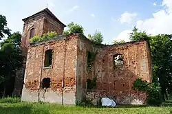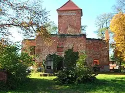 Die barocke Kirche wurde als Bau aus Ziegelmauerwerk in Form eines griechischen Kreuzes errichtet und hat einen eingezogenen quadratischen Westturm. Ursprünglich war die Kirche verputzt. Die Fassade ist mit Lisenen gegliedert. An den Wänden der Kreuzarme befanden sich jeweils zwei übereinander liegende Segmentbogenfenster, deren Öffnungen heute teilweise vermauert sind. Das Kirchenschiff war vor der Zerstörung mit einem Walmdach überzogen. Der erhaltene Dreiecksgiebel an der Nordwand enthält eine Kartusche mit einem Allianzwappen.[3]