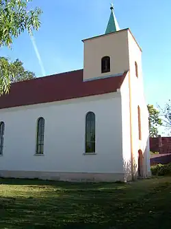 Das Gebäude besteht aus einem schlichten verputzten Saalbau mit einer polygonalen (fünfseitigen) Apsis und einem gedrungenen quadratischen Westturm, der in das Dach des Saalbaus integriert ist. Der Turm ist mit einem kurzen, eingezogen ansetzenden Zeltdach gekrönt.