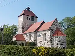 Die Kirche wurde als vollständige Anlage einer romanischen Dorfkirche mit Westquerturm, Schiff, Chor und Apsis um 1200 in Feldsteinmauerwerk erbaut. Der Turm ist mit Walmdach und einem kleinen Dachreiter bekrönt und öffnet sich zum Schiff in zwei Arkaden. Das Schiff und der Chor sind mit hölzernem Tonnengewölbe abgeschlossen, der Triumphbogen ist ausgebrochen. Eine dreiseitige Empore umgibt das Schiff, sie reicht nördlich bis zur Apsis, enthält Reste einer Empore von 1541 und stammt sonst inschriftlich aus der Zeit um 1700. Im Westen ist sie doppelgeschossig und oben für die Orgel vorschwingend ausgebildet; sie ist wie die übrige Ausstattung mit Rankenmalerei verziert.