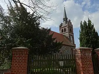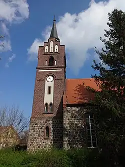 An das Kirchenschiff schließt sich nach Westen hin der quadratische und eingezogene Kirchturm an. Das untere Geschoss besteht aus lagig geschichteten und behauenen Feldsteinen. An der Nord- und Südseite ist eine spitzbogenförmige Öffnung, die mit rötlichem Mauerstein eingefasst ist. Der Zugang erfolgt über ein mächtiges, dreifach abgestuftes und ebenfalls spitzbogenförmiges Portal von der Westseite her. Der darüber liegende Teil des Bauwerks wurde aus rötlichem Mauerstein errichtet. Die schlanke Form wird dabei durch eine mittig angebrachte Blende verstärkt, die sich vom ersten Geschoss bis zur Höhe der Dachtraufe erstreckt. Dort ist eine kreisförmige Turmuhr, eine darunterliegende, schmale Öffnung sowie zwei gekuppelte spitzbogenförmige, kleine Fenster. Das Turmobergeschoss ist durch ein Gesims mit einer weißen Blende vom übrigen Baukörper abgesetzt. Dort ist eine spitzbogenförmige Klangarkade mit einem dreifachen Blendengiebel, der den Übergang zum mit Schiefer gedeckten Turmhelm schafft. Der Abschluss besteht aus einer Turmkugel mit Wetterfahne.