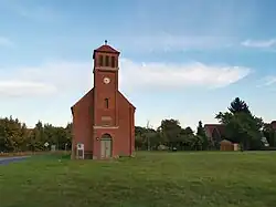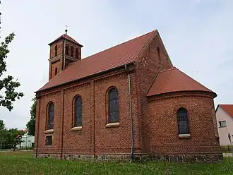 Die heute noch vorhandene Kirche entstand im Jahr 1872. Die Apsis wurde 2005 restauriert. Die Turmuhr war ein Geschenk des in Berlin lebenden Ingenieurs Haeseck aus dem Jahr 1894, die zum Ende des Zweiten Weltkrieges nicht mehr funktionstüchtig war. Ein Lehrer brachte die Uhr zur Reparatur nach Berlin; dort ging sie verloren. Durch eine Spendensammlung des Gemeindekirchenrats konnte ein neues Uhrwerk angeschafft und 2020 eingebaut werden.[1]