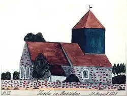 Die alte Dorfkirche, eine in der zweiten Hälfte des 13. Jahrhunderts in frühgotischen Formen erbaute Feldsteinkirche, umgab ein mit einer Feldsteinmauer eingefasster Friedhof. Die Kirche bestand aus einem kurzen Langhaus und einem kaum eingezogenen Chor von gleicher Dachfirsthöhe. Wie die Zeichnung des späteren Berliner Seidenwirkermeisters[4] Heinrich Wohler († 18. November 1894)[5] aus dem Jahr 1834 zeigt (s. Abb.), waren die Feldsteine relativ sorgfältig gequadert. 1496 wurde ein Gewölbe eingezogen. Die seit dem 14. Jahrhundert nachweisbare Kirchgemeinde Marzahn verlor mit der Reformation und dem Übertritt von Kurfürst Joachim II. zum lutherischen Glauben ihre Selbstständigkeit. Die Kirche wurde bis 1603 Tochterkirche von Biesdorf und anschließend bis nach dem Zweiten Weltkrieg von Friedrichsfelde.