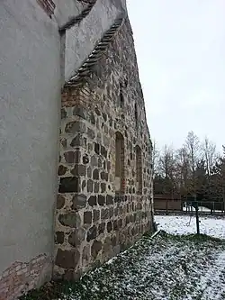 Das spitzbogige Westportal zeigt ein profiliertes Gewände aus Birnstabrippen. Im Anbau aus den 1950er Jahren befindet sich eine rechteckige Tür. Der Durchgang vom Gemeinderaum zum Chor dürfte vor dem Bau vermutlich das ursprüngliche Priesterportal gewesen sein. Der Anbau verfügt nach Süden über vier Fenster, drei Segmentbogenfenster mit Läden und ein Rundfenster. Zwei weitere Segmentbogenfenster befinden sich in der Ostwand des Chores, wobei die unteren 40 Zentimeter zugesetzt wurden. Über diesen sind zwei Schlitzfenster eingebracht. Auf der Nordseite befinden sich im Mauerwerk des Chores zwei unterschiedlich große, rechteckige Fenster, wobei das kleinere östliche nahezu quadratisch, während das westlichere hochrechteckig eingearbeitet wurde. Neben dem größeren Fenster erkennt man noch das Ziegelgewände eines älteren, vermauerten Fensters. Der Bogen dieses ist nicht erhalten. Im Kirchenschiff wurden auf der Nordseite zwei Korbbogenfenster eingearbeitet. Um diese finden sich wie um die nördlichen Rechteckfenster im Chor Faschen. In den Seitenwänden des Turmes befinden sich im ersten Geschoss jeweils schmale Spitzbogenfenster, die im oberen Teil zugesetzt wurden. Unterhalb der Fenster wurden jeweils zwei etwa zehn Zentimeter tiefe Blenden eingearbeitet. Neben dem Westportal befinden sich ebenfalls jeweils rechts und links zwei Blenden. Weiterhin zeigen sich auf der Westseite drei große Rundblenden zwischen Portal und Glockengeschoss. Im Glockengeschoss befinden sich jeweils zwei gekuppelte Schallöffnungen in Form von Segmentbögen unter einem großen Spitzbogen in der West- und in der Ostwand und jeweils eine derartige gekuppelte Schallöffnung auf der Nord- und der Südseite des Turms. Auf dem Turmdach sitzt seit 1996, nachdem der Dachreiter abgenommen werden musste, ein Aufsatz mit Turmkugel und Windfahne. An der Ostwand des Turmes kann man heute noch den Ansatz eines ursprünglich höheren und steileren Schiffsdaches erkennen. Heute besitzt er ein queres Walmdach. Seit dem Umbau nach dem Brand 1607 befinden sich das Kirchenschiff und der Chor unter einem einheitlichen Satteldach. Der später errichtete Anbau besitzt ein Pultdach, welches im Dach Satteldach des Schiffs und des Chores ausläuft. Auf das Pultdach wurde am östlichen Giebel ein Schornstein gemauert.[5]