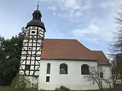 Im Westen erstreckt sich der quadratische Kirchturm. Er fußt auf einem verputzten Sockel, ist im Übrigen aber auch Fachwerk errichtet. An der Nord- und Südseite sind im unteren Bereich je ein kleines, hochrechteckiges Fenster. Im Glockengeschoss verjüngt sich der Aufsatz zu einem oktogonalen Oberteil mit je einem Ochsenauge an den vier Himmelsrichtungen. Darüber ist eine Welsche Haube mit offener Laterne, die mit Turmkugel, Wetterfahne und Stern abschließt.