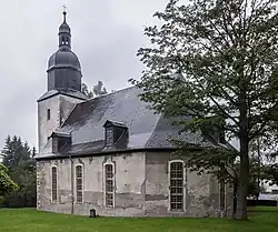 Der Grundstein für die Saalkirche wurde am 16. Mai 1738 gelegt. 1743 wurde der Bau fertiggestellt, eingeweiht aber erst 1760. Das mit einem schiefergedeckten Satteldach bedeckte Langhaus hat einen dreiseitigen Abschluss im Osten, im Westen steht der Turm, auf dem eine achtseitige Haube sitzt, die von einer offenen Laterne mit Turmkugel bekrönt ist. Die Glocke befindet sich in dem frei stehenden Glockenturm.