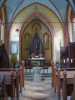 Das im neogotischen Stil ausgeführte und von einem Kreuzgewölbe überspannte Kirchenschiff ist rechteckig. Die Chornische ist nach Osten ausgerichtet, der Zugang zur Kirche erfolgt durch das Untergeschoss des nach Westen ausgerichteten Turmes.