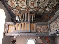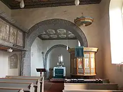 Die Kirche ist im Inneren reich ausgemalt. So zieren die Brüstungsfelder der Empore Bilder des Leidensweges Jesu. Die Decke des Kirchenschiffes ist in fünf mal vier Felder aufgeteilt, die jeweils eine Engelsfigur ziert. Dieses setzt sich im Altarraum fort, der sich allerdings durch die Höhe und einen Rundbogen vom Kirchenschiff absetzt. Die Kanzel ist ähnlich gestaltet, zeigt allerdings Menschen.