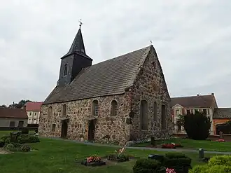Die Dorfstraße führt von Westen kommend auf den historischen Dorfanger zu. Dort spannt sie ein ellipsenförmiges Grundstück auf und verläuft weiter in nordöstliche Richtung. Die Kirche steht auf dieser Fläche, die mit einer Mauer aus Mauersteinen eingefriedet ist.