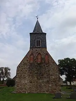 Der Westturm nimmt die volle Breite des Kirchenschiffs auf. An seiner westlichen Fassade ist keine Öffnung. Im Giebel sind drei mit Mauersteinen zugesetzte, spitzbogenförmige Blenden. Daran schließt sich ein quadratischer Turmhelm an. Er ist mit schwarzem Schiefer verkleidet und hat an jeder Seite eine segmentbogenförmige Klangarkade. Das Pyramidendach schließt mit Turmkugel, Wetterfahne und Kreuz ab.