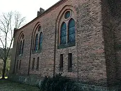 Das Bauwerk entstand im Wesentlichen aus rötlichem Mauerstein auf einem Sockel aus unbehauenen und nicht lagig geschichteten Feldsteinen. Der Chor ist stark eingezogen und hat einen rechteckigen Grundriss. An der Ostwand ist eine Dreifenstergruppe bestehend aus einem Lanzett-Drillingsfenster mit überhöhtem Spitzbogen, deren Gewände ebenfalls mit rotem Mauerstein eingefasst sind. Im darüberliegenden und mit Fialen verzierten Giebel ist ein Ochsenauge. Der Chor wird durch je zwei dreifach getreppte Strebepfeiler stabilisiert. An der Südseite ist ein rechteckiger Anbau, der von einer Holztür von Süden her betreten werden kann. Östlich davon ist ein gedrückt-segmentbogenförmiges Fenster, ebenso an der Ostwand des Anbaus. Chor und Anbau sind mit Biberschwanz gedeckt.