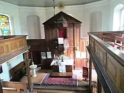 Im Inneren verfügt die Kirche über einen hölzernen Kanzelaltar und eine offene hölzerne Hufeisenempore entlang der Rückwand und der beiden Seitenwände in schlichten Barockformen, die aus der Bauzeit der Kirche stammen. Die Holzflächen sind kassettiert und nicht farbig gefasst, sondern vermitteln durch ihre dunkle Holzsichtigkeit einen strengen Raumeindruck.