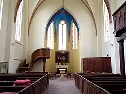 Im Kirchhof steht ein überwölbtes Kirchhofsportal mit den Brustbildern Martin Luthers und Philipp Melanchthons in Sgraffito. Neben der Kirche steht ein Kriegerdenkmal aus dem Jahre 1921.