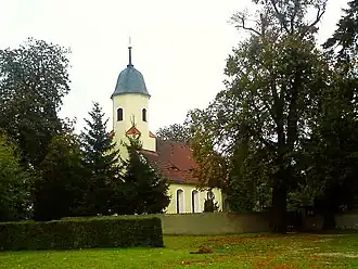 Die im 17. Jahrhundert wohl unter Verwendung von Resten eines einst hier vorhandenen mittelalterlichen Vorgängerbaus errichtete Kirche ist mit einem angrenzenden Friedhof etwas abseits vom Ortszentrum zu finden.[2]