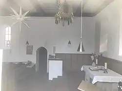 Die Kirchenausstattung wurde in den 1950er Jahren nahezu komplett ausgetauscht. Der schlichte Altar ist gemauert; darauf steht ein Kreuz aus Messing, das an den vier Enden die Symbole der vier Evangelisten und mittig das Christusmonogramm zeigt. Die Kanzel steht links davon und ist ebenfalls gemauert. Rechts vom Altar steht die steinerne Fünte aus dem Jahr 1959. Hinter dem Altar befinden sich drei Glasfenster, die der Maler Gerhard Olbrich im Jahr 1959 schuf. Sie wurden in der Glaswerkstatt Lehmann in Berlin hergestellt und zeigen Motive aus der Bibel. Die Kirchengemeinde interpretiert im linken Bild einen Bezug zur Anfrage des Täufers aus dem Evangelium nach Matthäus 11,1 , im mittleren Bild einen Bezug zu Christi Himmelfahrt aus dem Evangelium nach Lukas 24,1 und im rechten Bild einen Bezug zum Abendmahl Jesu 14,15 .[3] Die Vorhalle im Turm ist vergleichsweise schlicht gehalten. Der Besucher gelangt über eine gedrückt-segmentbogenförmige Tür in den Bereich unterhalb der Empore.