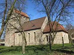 Die Dorfkirche ist ein Saalbau aus Feldsteinquadern aus der ersten Hälfte des 13. Jahrhunderts, mit eingezogenem Chor und mächtigem, leicht aus der Flucht der Schiffswände vortretendem Westquerturm. Sie wurde in den Jahren 1654–1663 wiederhergestellt, wobei vermutlich der Chor infolge der Zerstörungen mit Rechteckschluss anstelle einer Apsis wiederhergestellt wurde.[1] In den Jahren 1805/06 erfolgte eine Erneuerung des Chorschlusses, 1854 wurden die Fenster stichbogig erweitert und ein nördlicher Emporenaufgang am Chor angebaut. In den Jahren 1904/05 wurde eine eingreifende Renovierung vorgenommen.