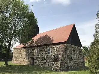 Beim Bau wurden im Wesentlichen Feldsteine genutzt, die behauen und teilweise lagig geschichtet wurden. Der Chor ist gerade und nicht eingezogen. An der Ostwand sind die Reste einer zugesetzten Dreifenstergruppe erkennbar. Der darüberliegende Giebel ist verbrettert. Das Bauwerk wird durch Strebepfeiler aus Mischmauerwerk an den Ecken des Chores stabilisiert.