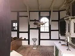 Eine Besonderheit stellt der Taufengel dar, er im ersten Viertel des 18. Jahrhunderts entstand. Das Werk wird der Werkstatt des Bildhauers Tobias Mathias Beyermann zugeschrieben. Das Dehio-Handbuch begründet dies unter anderem mit stilistischen Besonderheiten, darunter der „bandartige obere Rand und die spitzzackigen Federn der Flügel“. Es ist denkbar, dass es sich um ein frühes Werk des Bildhauers handelt. Die 1,56 m große Figur wurde in den 1990er Jahren überfasst. Das Dehio-Handbuch kritisiert, dass diese Arbeit „unsachgemäß und sehr plakativ“ erfolgte und daher eine exakte Einstufung des Werks erschwert. Er lag über viele Jahre auf dem Dachboden der Kirche und wurde in den 1990er Jahren nordwestlich des Altars aufgehängt.