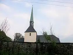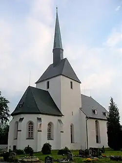 Die auf einer Anhöhe oberhalb des Dorfes liegende Saalkirche geht auf einen romanischen Gründungsbau aus der Zeit um 1200 zurück. Sie wird durch einen weithin sichtbaren Chorturm mit verschiefertem Walmdach und hohem achteckigem Dachreiter geprägt. Der Chor mit Fünfachtelschluss und nördlich angebauter Sakristei wurde zu Beginn des 16. Jahrhunderts anstelle der ursprüngliche Apsis erbaut. Die Fenster sind zum Teil mit Spitzbögen und Maßwerk ausgestattet. 1529 wurden der heutige Turmaufsatz erbaut und das dreibahnige Fenster auf der Südseite eingefügt. Um 1700 wurde das Innere umgestaltet, wobei einige Fenster auf der Südseite vergrößert wurden. Die beiden Vorhallen an der Südseite wurden gegen Ende des 18. Jahrhunderts angebaut, die neue Sakristei stammt von 1785. Im Jahr 1817 wurde die Kirche im Sinne des Klassizismus umgestaltet, wobei unter anderem die Fenster auf der Nordseite vergrößert wurden. Eine Umgestaltung des Chores mit Rekonstruktion des nördlichen Fensters wurde 1965 vorgenommen, eine Restaurierung des Inneren erfolgte 1997.
