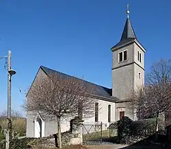 Das Bauwerk ist ein Putzbau mit dreiseitigem Ostschluss, flach geneigtem Satteldach und Stichbogenfenstern; das Eingangsportal liegt im Westen. Ein breiter Turm mit Knickhelm, dessen klassizistisches Eingangsportal mit den Initialen des Patronatsherren und der Jahreszahl 1829 akzentuiert das Bauwerk. Der Turmaufsatz trägt eine Spitze aus dem Jahr 1883.
